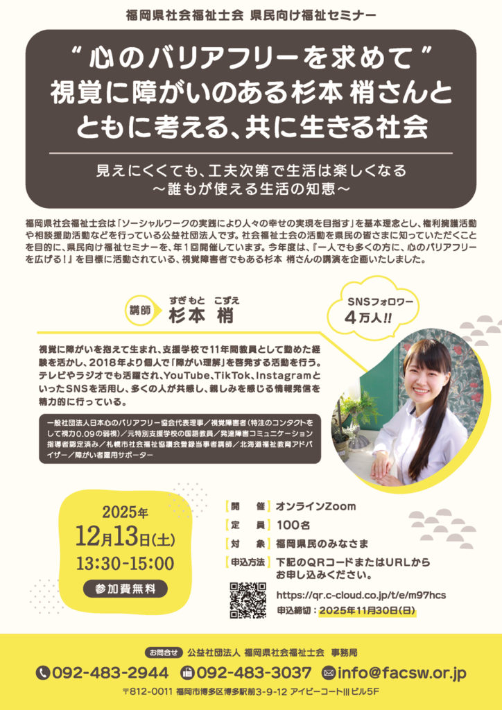 開催日:12月13日(土) 13:30~15:00開 催:オンラインZOOMにて無料講演講師:杉本 梢 氏募集人員:100名(先着順)申込締切:11月30日(日)